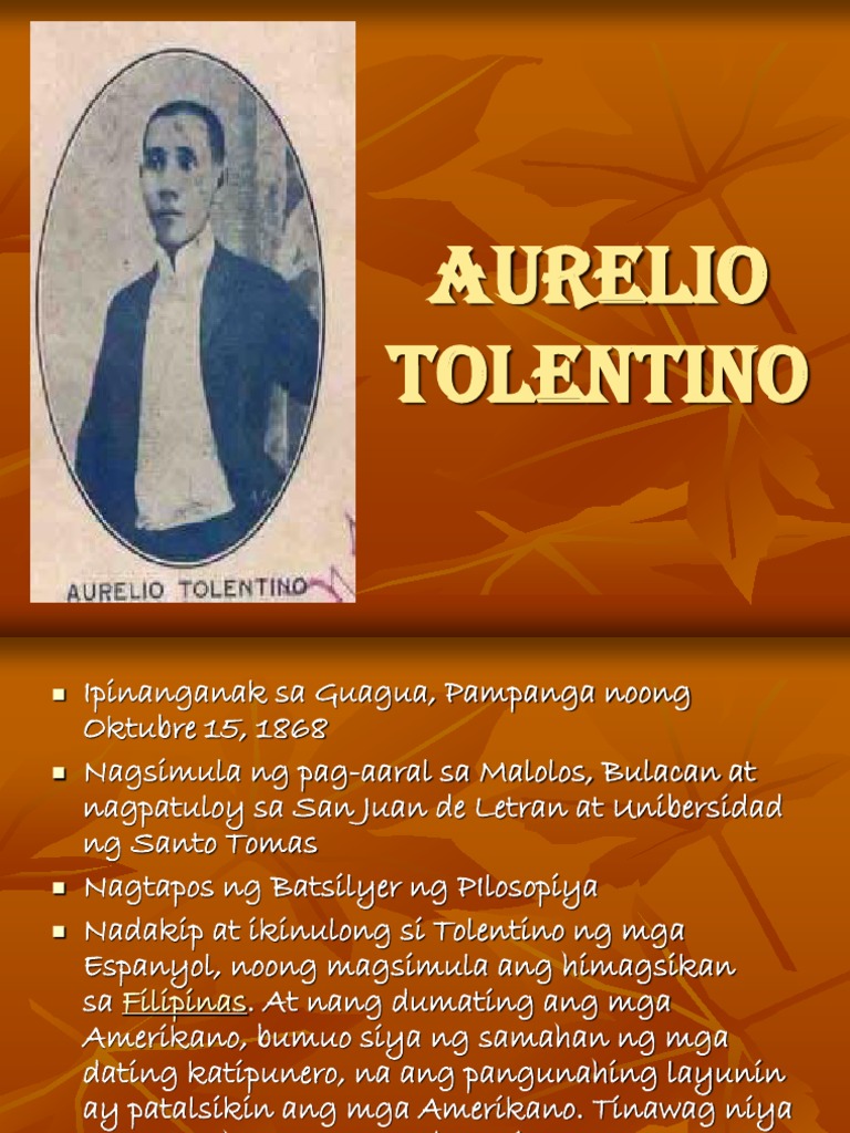 5162009 On May 14 1903 Aurelio Tolentino October 13 1867-July 3 1915 a Pampango playwright poet essayist educator novelist and public servant was arrested because of his play Kahapon Ngayon at Bukas Larawan ng Inang Bayan. Education Aurelio and his brother both obtained their primera enzeanza. Romulo crisalidas by fernando ma.
